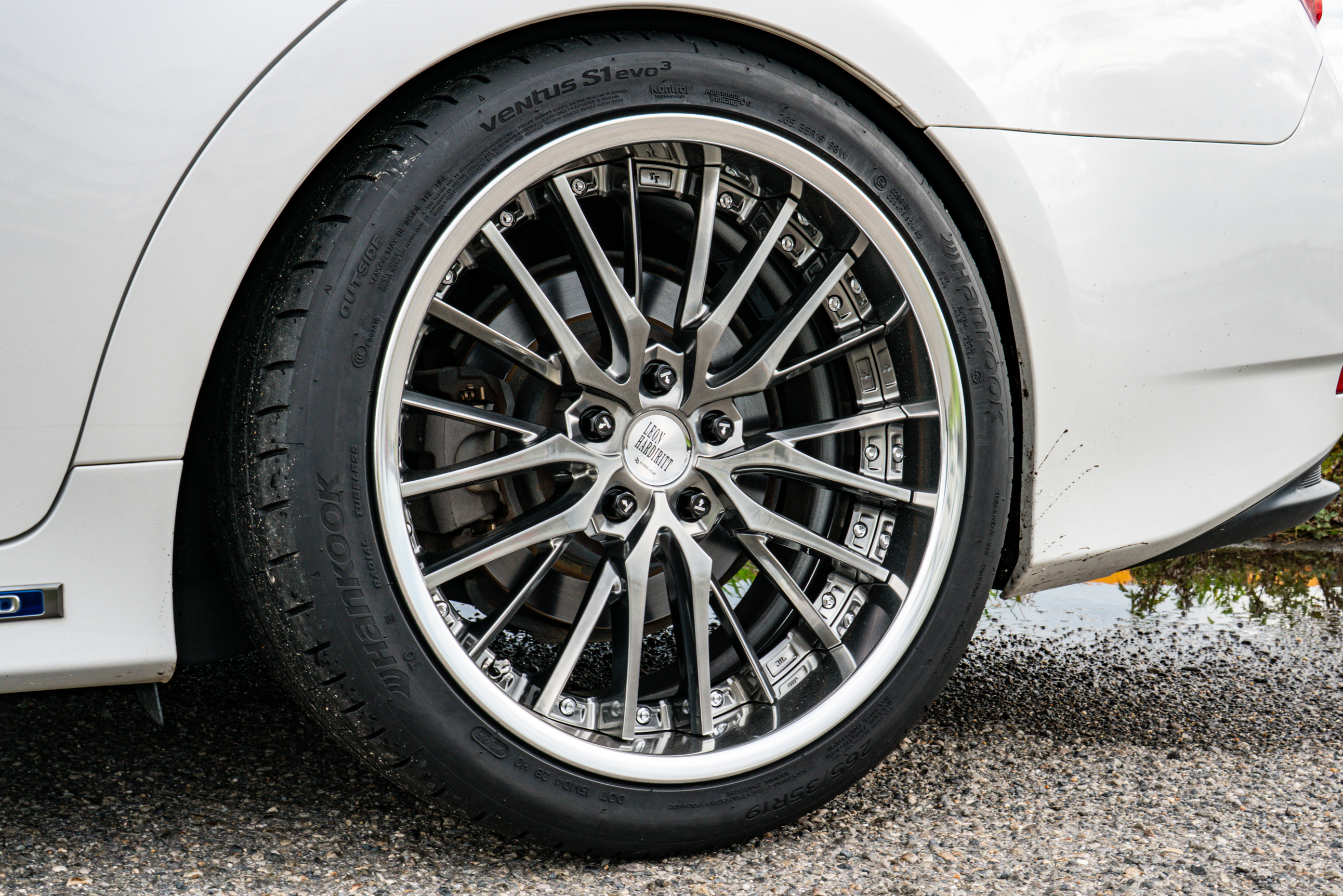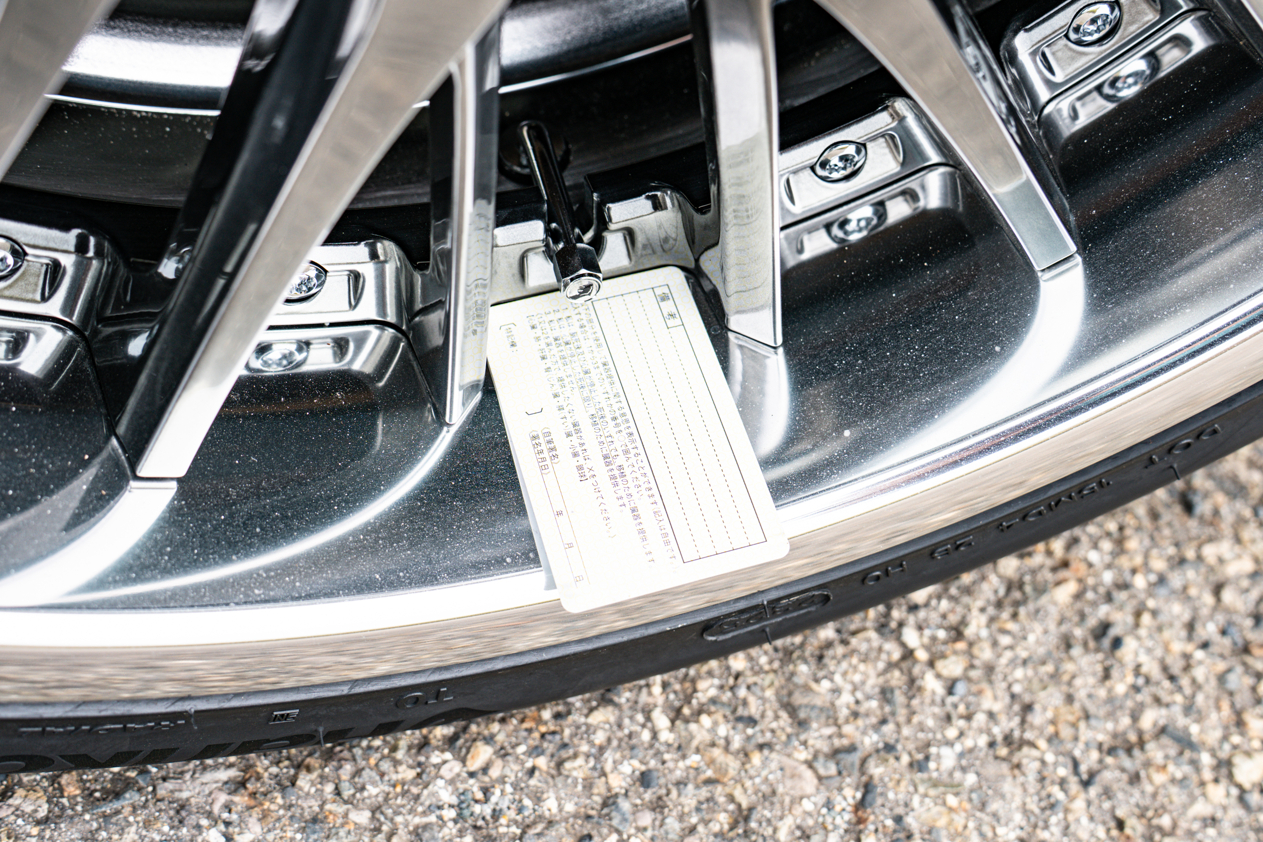 タイヤの扁平率が変わったことで、足元が引き締まり、全体のシルエットにメリハリが出ました。 2インチアップですが、車高調とのバランスも良く、フェンダーとの干渉もなし。インセット値は非公開ですが、安全性と見た目のベストバランスを目指したセッティングになっています。
