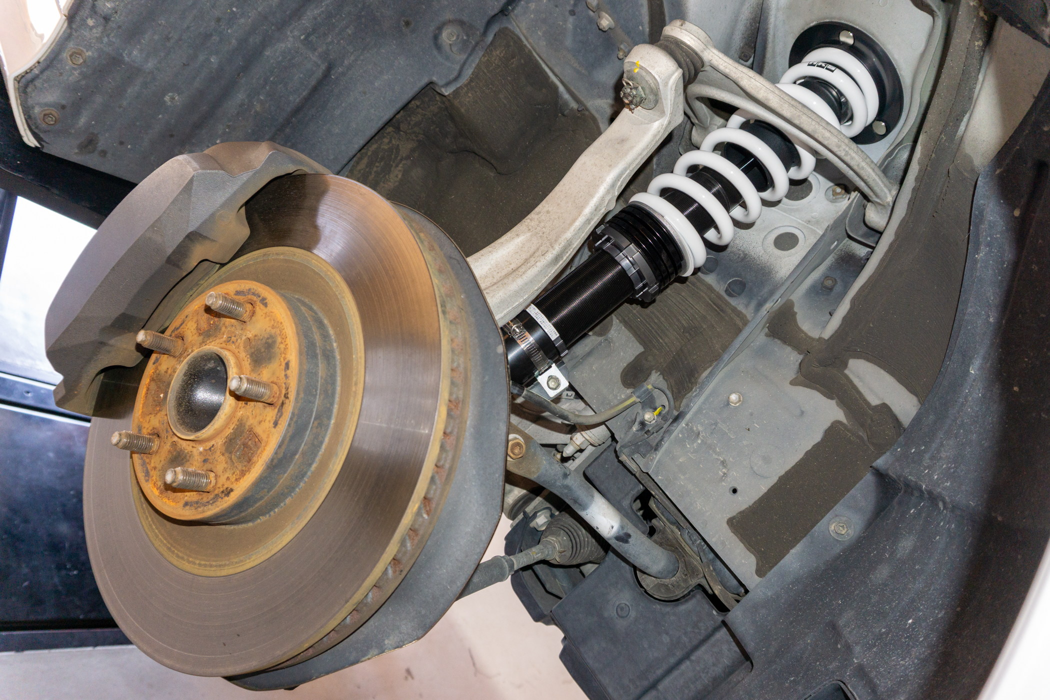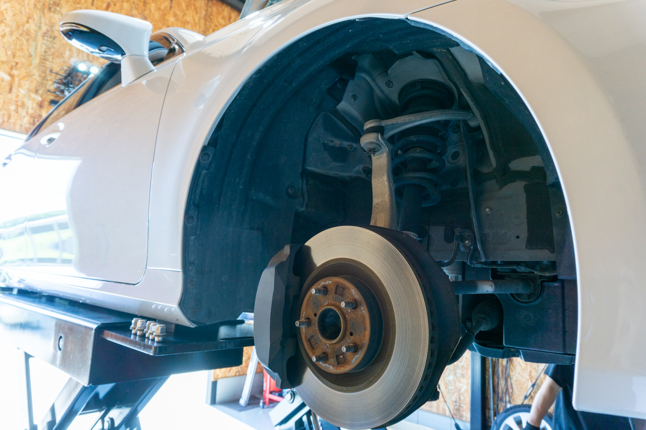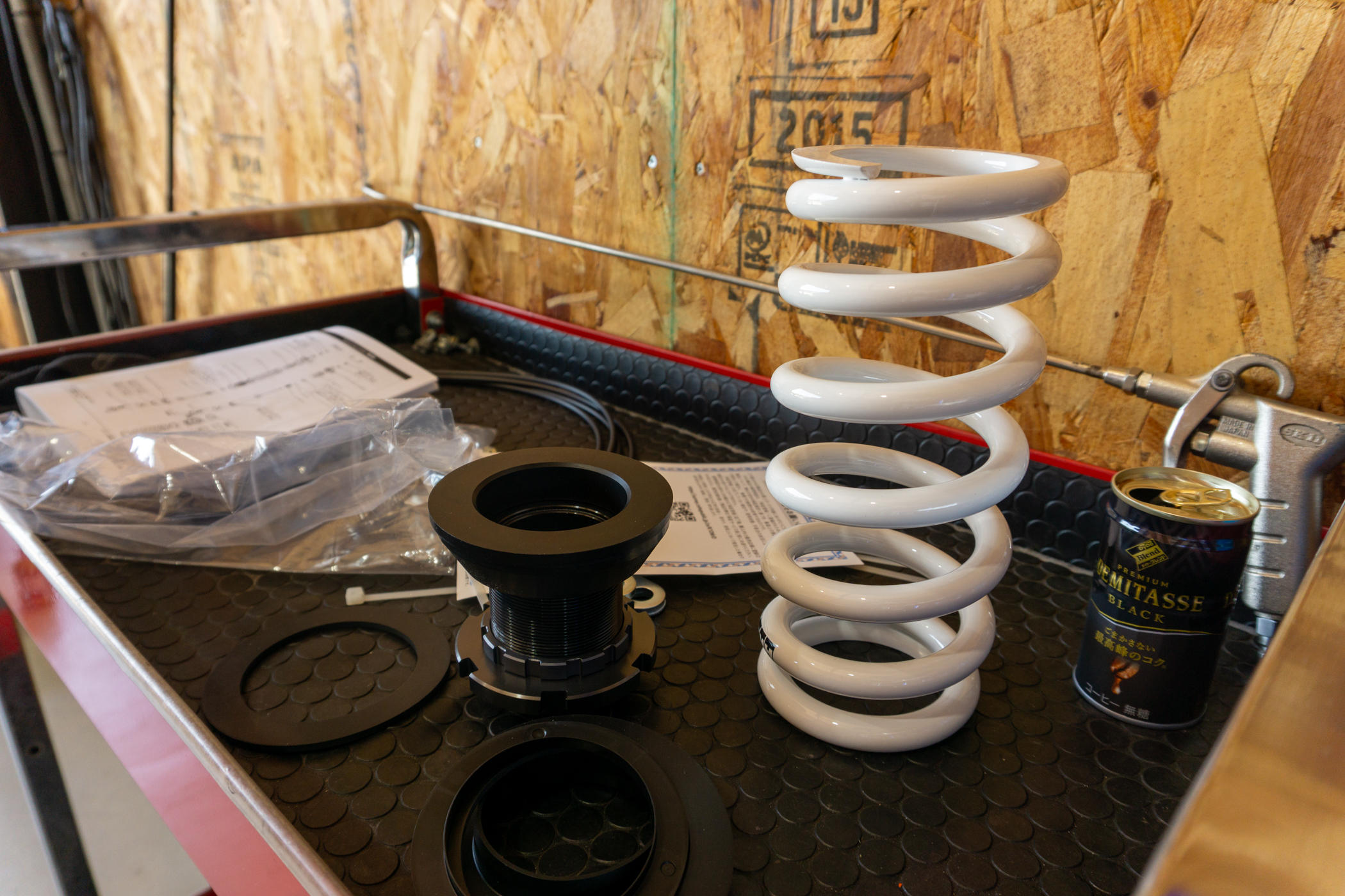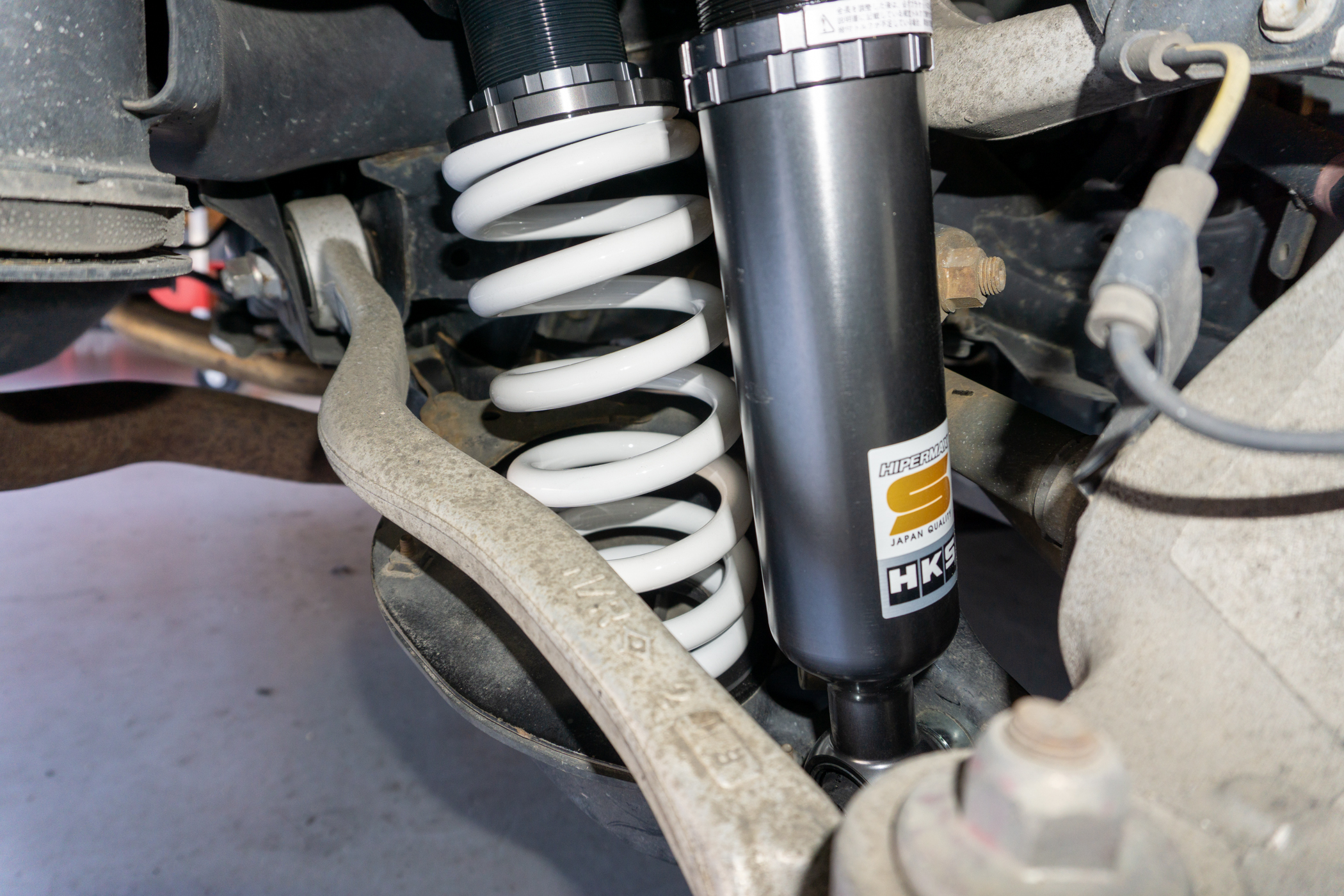 作業中は、古い純正サスが外され、ピカピカのHKS車高調が足回りに組み込まれていく様子にテンションが上がります。クルマ好きにとって、こういう光景は本当にたまりません。